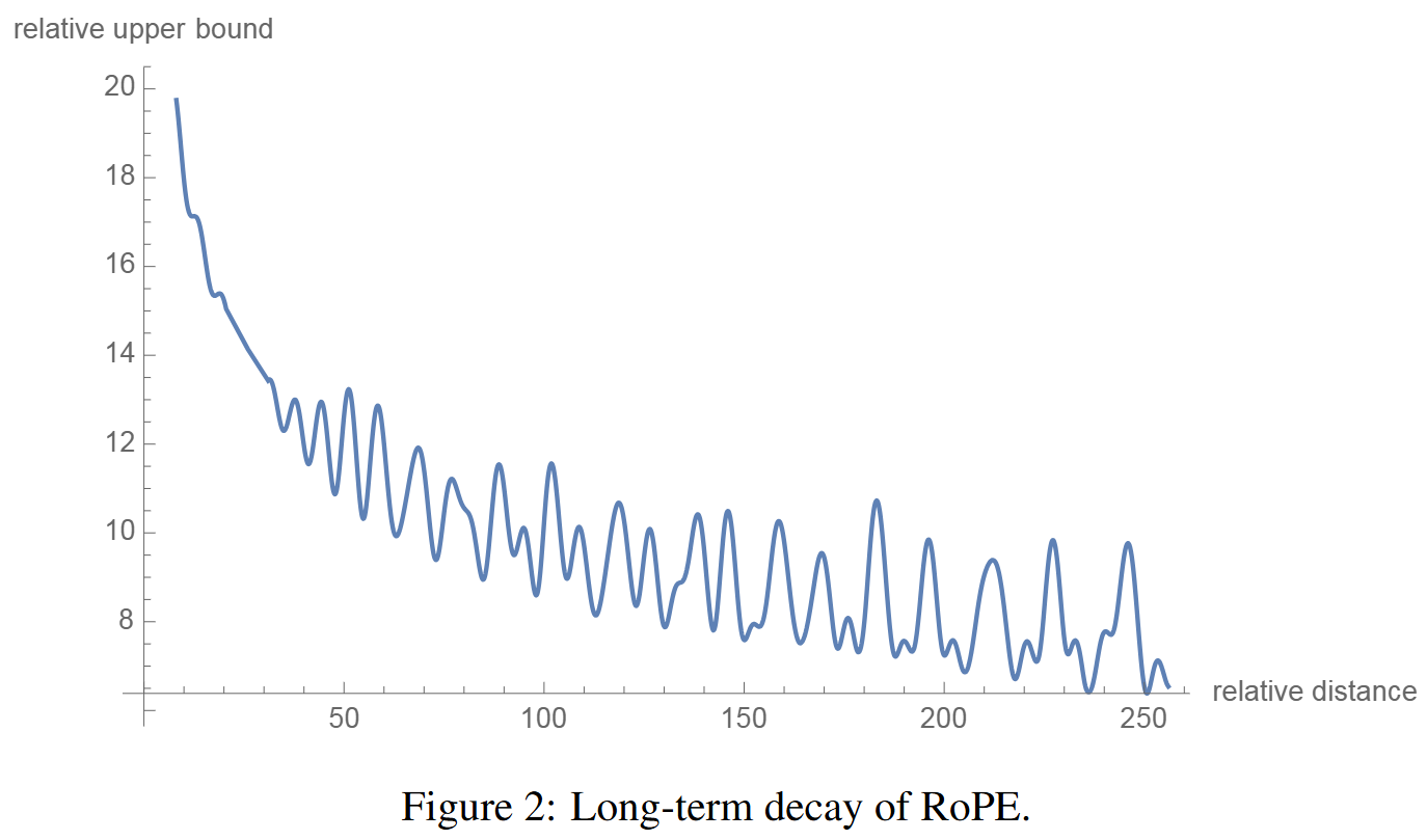 - 长期衰减:设置 θi=10000−2i/d 其提供了长期衰减的特性。随着相对距离的增加,内积会不断衰减。(更远的距离提供更少的关联)