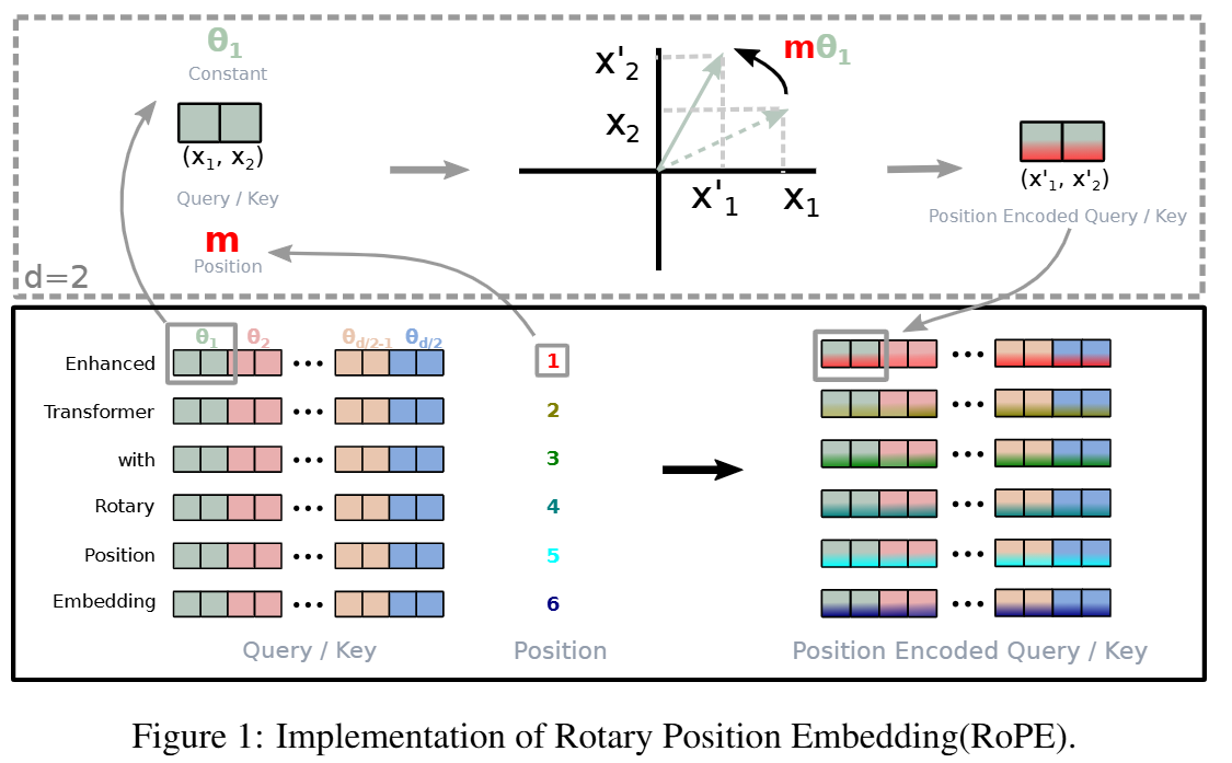 - 提出一种相对位置:旋转位置嵌入(RoPE),通过旋转矩阵编码相对位置