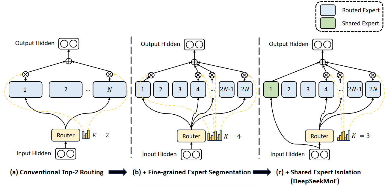 - 架构创新:提供一种新的 MoE 架构,采用细粒度专家分割和共享专家隔离两种主要策略